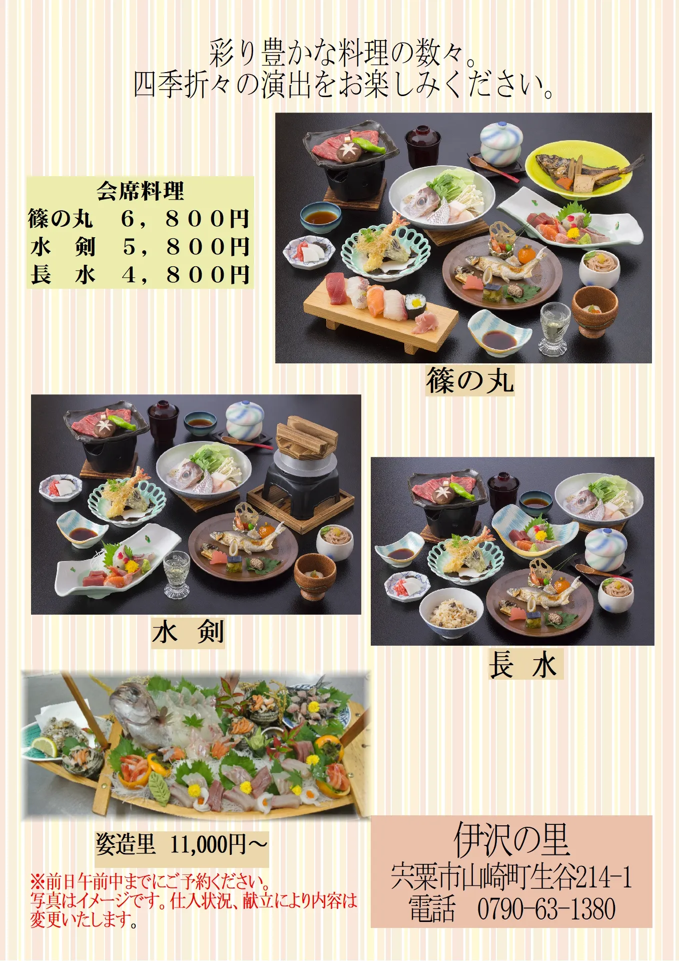 山や川など、清らかな自然がもたらす本物の贅沢。旬の味覚を取り揃えた、お祝いの宴席にふさわしい華やかな会席料理や、在りし日を偲び、落ち着いた雰囲気の中で味わう法要料理。自然あふれる伊沢の里で、本物の贅沢をご堪能ください。